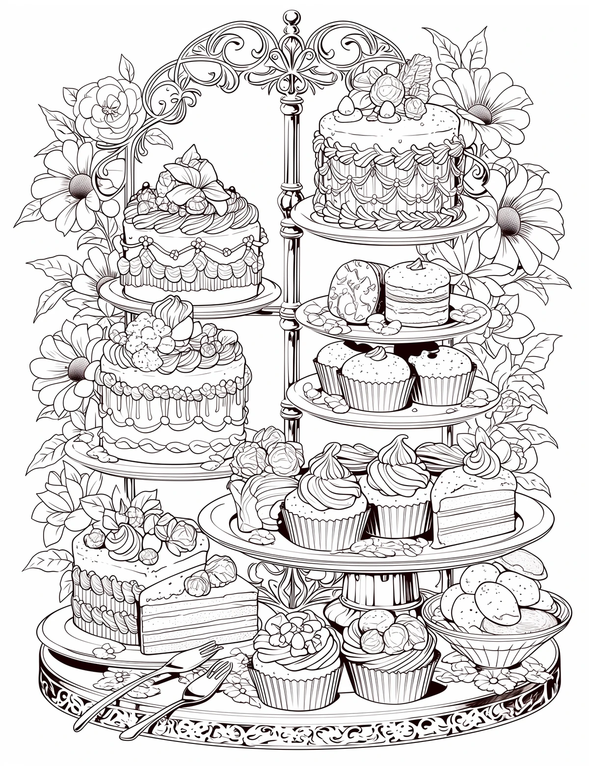 Lavish dessert tower coloring page with cakes, cupcakes, pastries, and flowers